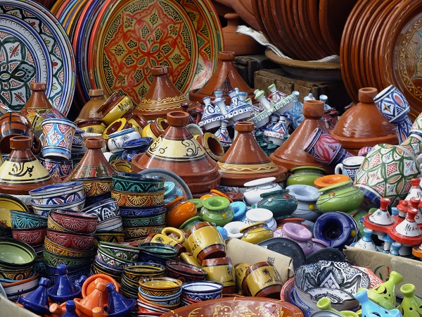 Maroko se proslavilo svou malovanou keramikou. Talíře, misky, džbány s barevnými geometrickými, vzory v arabském stylu. Marocká historie byla ovlivněna Římany, Vandaly, Vizigóty i Byzantinci a tyto vlivy se projevily i v keramice. Na marockou keramiku narazíte snad na všech trzích i v pouličních Marrákeše, Meknésu, Agadiru, Rabatu…Keramika v každém regionu se liší ve tvarech i převažujících barvách. Pro Fez je typická modrá barva keramiky. V královském městě Meknés pak dominuje zelená barva. Unikátním výrobkem, který si můžete domů odvézt, je keramická nádoba tažín. Pokud v ní chcete doma připravovat pokrmy, odvezte si tažín bez barevné glazury.
